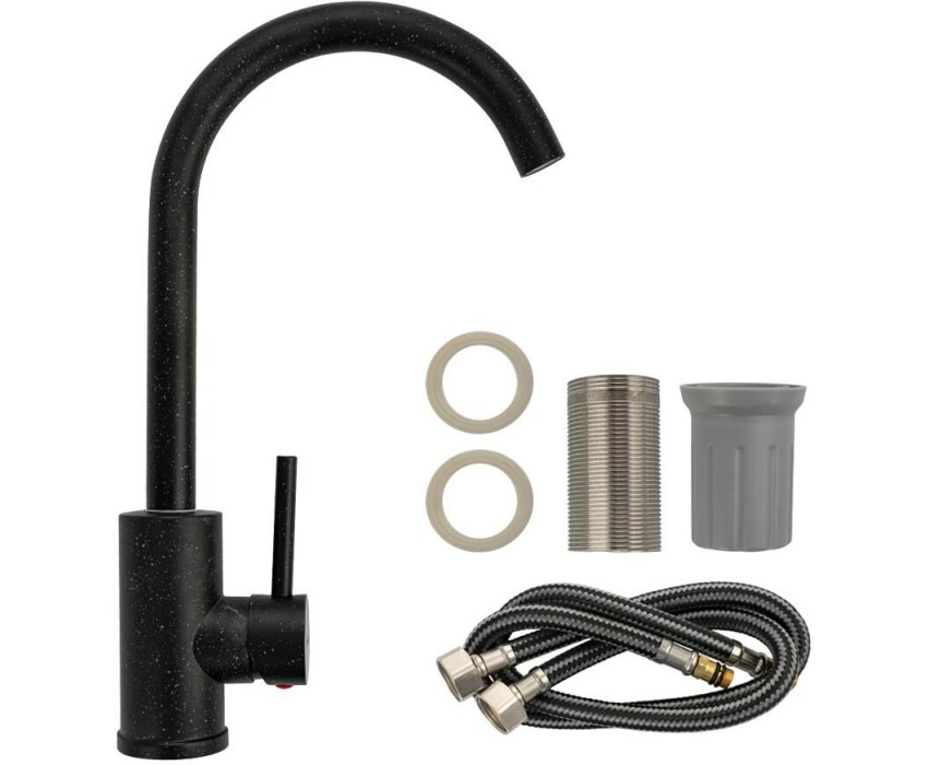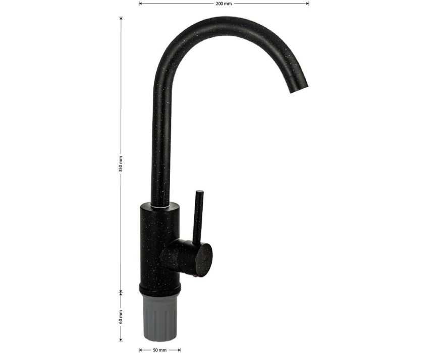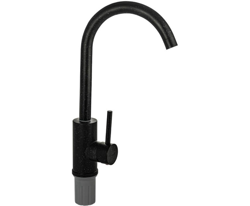 Смеситель для кухонной мойки и раковин, литой матовый корпус, из нержавеющей стали и аллюминия, с высоким С-образным изливом, шаровый,Цвет черная эмаль с вкраплениями. Крепление резьба - гайка, картридж d = мм, ручка литая. Аэратор для экономии воды. Такая модель может использоваться на домашней кухне, на даче, в медицинских учреждениях и общественных местах. Габаритные размеры: высота 350 мм, длина 200 мм, диаметр посадочного седла 50 мм, длина резьбы 60 мм, длина подводки 450 мм. Вес - 0.98 кг, объём - 0.00516 м3. В комплекте паспорт, корпус с изливом, подводка 1/2, крепеж, набор прокладок.