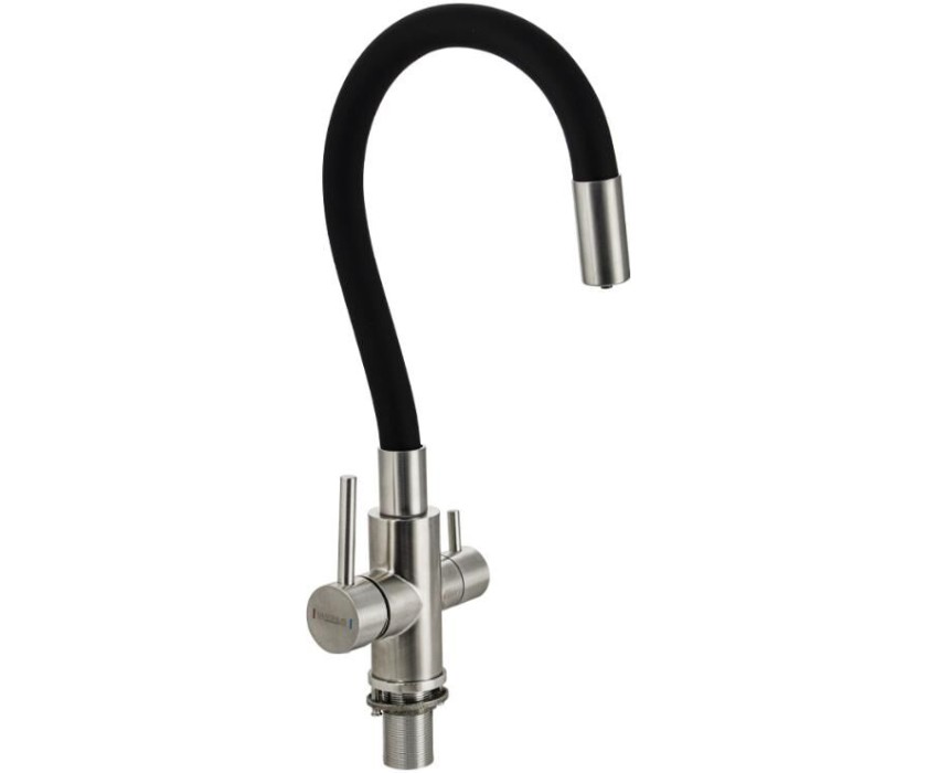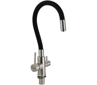 МАГНУС - Смеситель для кухни, гибкий ЧЕРНЫЙ излив, шаровый, с двойным выпуском воды для фильтра, корпус из нержавеющей стали марки 304, цвет САТИН. 91129