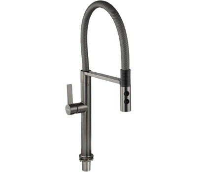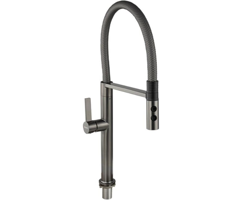 МАГНУС - Смеситель для кухни, с гибким серым изливом с магнитной фиксацией, двухрежимный аэратор, корпус из нержавеющей стали марка SUS 304, цвет корпуса ГРАФИТ. 91136