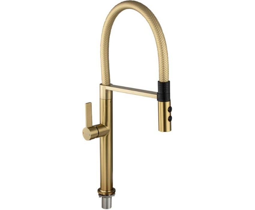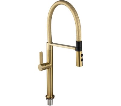 МАГНУС - Смеситель для кухни, с гибким рельефным изливом с магнитной фиксацией, двухрежимный аэратор, корпус из нержавеющей стали марка SUS 304, цвет корпуса матовое ЗОЛОТО. 91137
