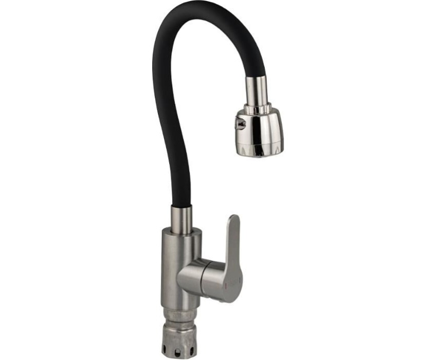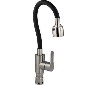 МАГНУС - Смеситель для кухни, с гибким чёрным изливом и двухрежимным аэратором, корпус из нержавеющей стали марки SUS 304, цвет САТИН. 9216-B
