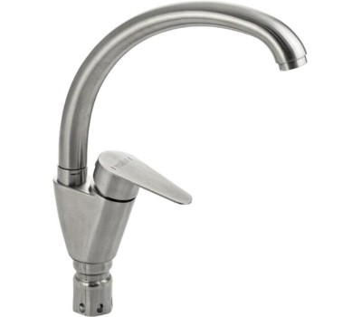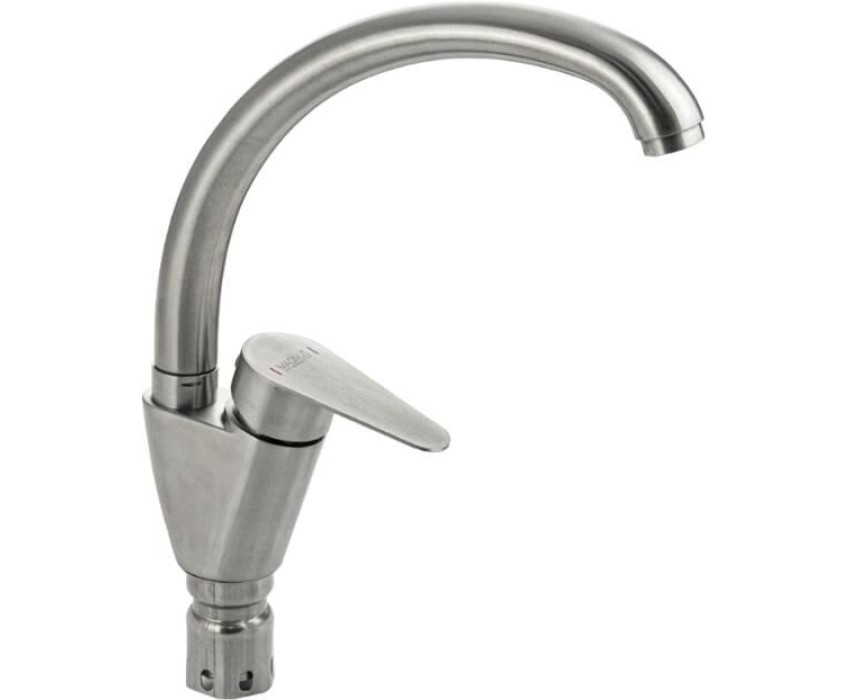 Смеситель для кухонной мойки и раковин, боковой, литой матовый корпус, из нержавеющей стали марки 304, с высоким С-образным изливом, шаровый. Крепление резьба - гайка, картридж d = 35 мм, ручка литая. Аэратор для экономии воды. Такая модель может использоваться на домашней кухне, на даче, в медицинских учреждениях и общественных местах. Габаритные размеры: высота 280 мм, длина 250 мм, диаметр посадочного седла 50 мм, длина резьбы 50 мм, длина подводки 500 мм. Вес - 1,110 кг, объём - 0,00433 м3. В комплекте паспорт, корпус с изливом, подводка 1/2, крепеж, набор прокладок.