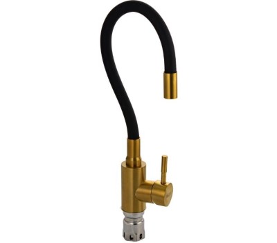 Смеситель для кухонной мойки и раковин, литой матовый корпус, цвет золото из нержавеющей стали марки 304, с высоким гибким изливом черного цвета, с аэратором для экономии воды, шаровый. Крепление резьба - гайка, картридж d = 35 мм, ручка литая. Такая модель может использоваться на домашней кухне, на даче, в медицинских учреждениях и общественных местах. Габаритные размеры: высота до 400 мм, длина до 200 мм, диаметр посадочного седла 40 мм, длина резьбы 55 мм, длина подводки 600 мм. Вес - 1,0 кг, объём - 0,00543 м3. В комплекте паспорт, корпус с изливом, подводка 1/2, крепеж, набор прокладок.