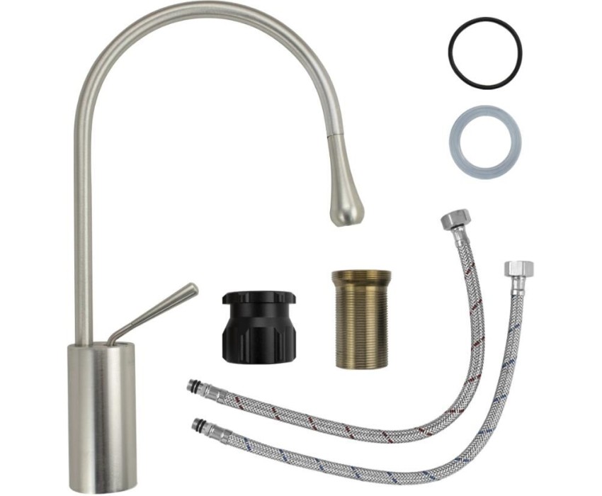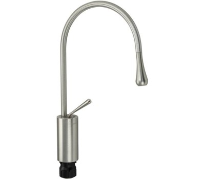 Смеситель для кухонной мойки и раковины, из авиационного алюминия, цвет сатин, боковой, с высоким С - образным элегантным изливом, шаровый. Крепление резьба - гайка, картридж d = 25 мм, ручка шток. Большой каплевидный аэратор для экономии воды. Габаритные размеры: высота 400 мм, длина 245 мм, диаметр посадочного седла 55 мм, длина резьбы 45 мм, длина подводки 400 мм. Вес - 1,500 кг, объём - 0,011 м3. В комплекте паспорт, корпус с изливом, подводка 1/2, крепеж, набор прокладок.