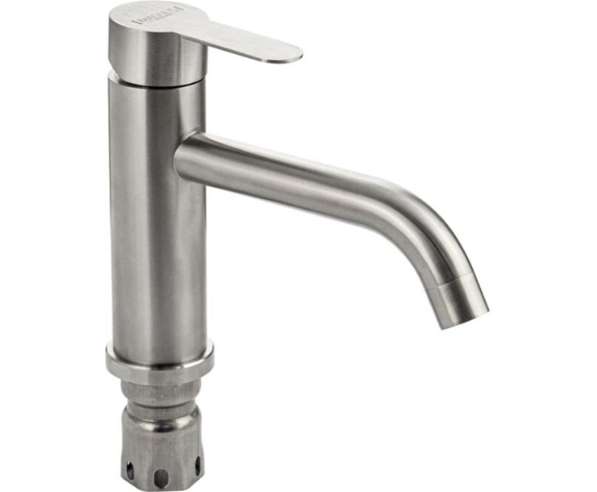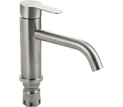 Смеситель для раковины, матовый литой корпус, из нержавеющей стали марки 304, с длинным изогнутым изливом, ручка литая, шаровый. Крепление резьба - гайка, картридж d = мм. Аэратор для экономии воды. Такая модель может использоваться на домашней кухне, на даче, в медицинских учреждениях и общественных местах. Габаритные размеры: высота 170 мм, длина 200 мм, длина излива 160 мм, диаметр посадочного седла 50 мм, длина резьбы 55 мм, длина подводки 450 мм. Вес - 0.89 кг, объём - 0.00281 м3. В комплекте паспорт, корпус, подводка 1/2, крепеж, набор прокладок.