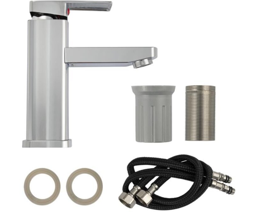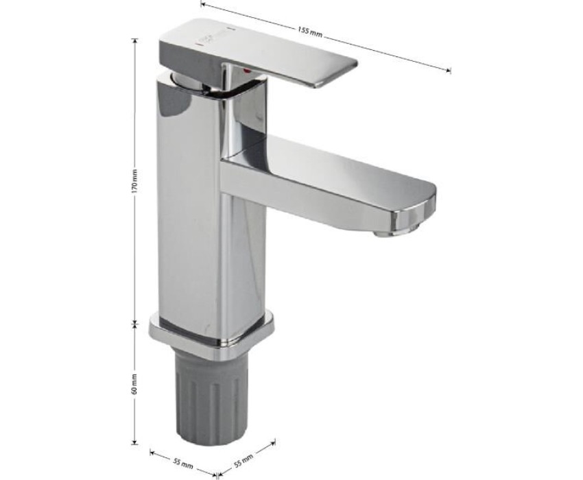 Смеситель для раковины, модель элегант, из высокопрочного пластика АБС, ХРОМ с коротким изливом, литой квадратный корпус, литая ручка, шаровый. Крепление резьба - гайка, картридж d = 40 мм. хромированный аэратор для экономии воды. Габаритные размеры: высота 170 мм, длина 155 мм, посадочное седло 55*55 мм, длина резьбы 60 мм, длина подводки 450 мм. Вес - 0.92 кг, объём - 0.00273 м3. В комплекте паспорт, корпус, пластиковая подводка с латунными штуцерами 1/2, крепеж, набор прокладок.