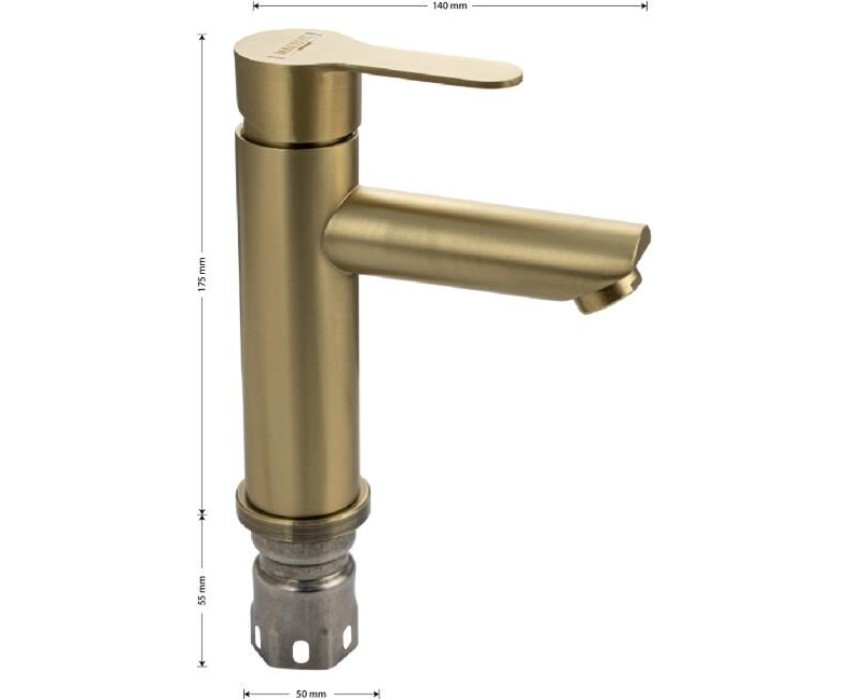 Смеситель для раковины, матовый литой корпус под золото, из нержавеющей стали марки 201, с коротким литым изливом, литая ручка, шаровый. Крепление резьба - гайка, картридж d = 35 мм. Аэратор для экономии воды. Такая модель может использоваться на домашней кухне, на даче, в медицинских учреждениях и общественных местах.Габаритные размеры: высота 175 мм, длина 140 мм, диаметр посадочного седла 50 мм, длина резьбы 55 мм, длина подводки 450 мм. Вес - 0.8 кг, объём - 0.002 м3. В комплекте паспорт, корпус, подводка 1/2, крепеж, набор прокладок.
