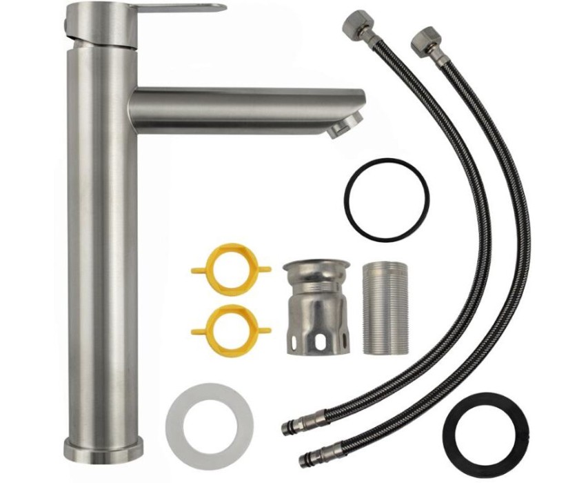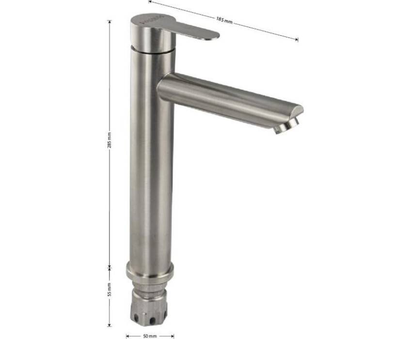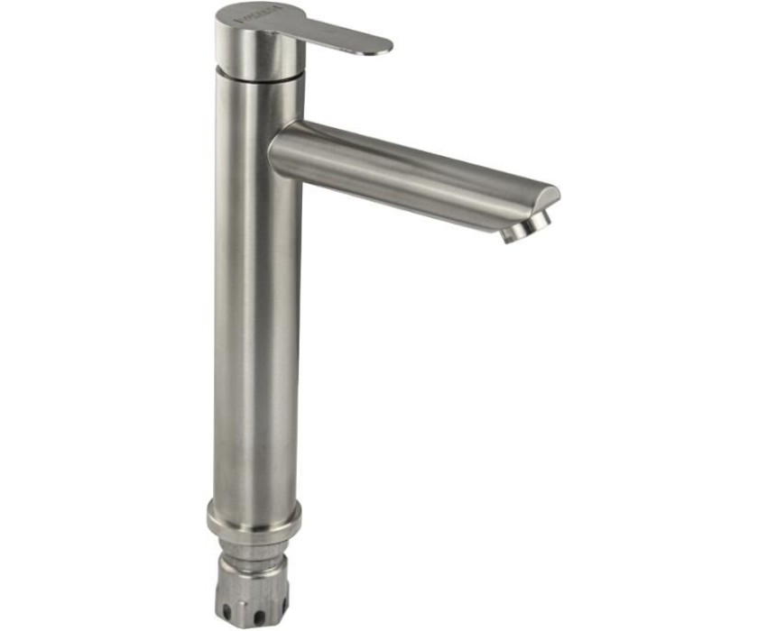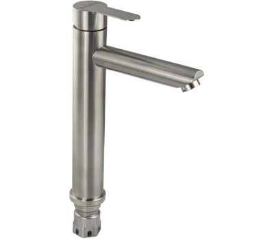 Смеситель для раковины, высокий матовый литой корпус, из нержавеющей стали марки 304, с прямым изливом, ручка шток, шаровый. Крепление резьба - гайка, картридж d = 35 мм. Аэратор для экономии воды. Такая модель может использоваться на домашней кухне, на даче, в медицинских учреждениях и общественных местах. Габаритные размеры: высота 285 мм, длина 185 мм, диаметр посадочного седла 50 мм, длина резьбы 55 мм, длина подводки 450 мм. Вес - 1.21 кг, объём - 0.00438 м3. В комплекте паспорт, корпус, подводка 1/2, крепеж, набор прокладок.