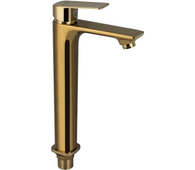 Смеситель для раковины, высокий, литой корпус, цвет золото, с прямым плоским изливом, ручка литая, шаровый. Крепление резьба - гайка, картридж d = 35 мм. Аэратор для экономии воды. Такая модель может использоваться на домашней кухне, на даче, в медицинских учреждениях и общественных местах. Габаритные размеры: высота 300 мм, длина 175 мм, посадочное седло 45*45 мм, длина резьбы 35 мм, длина подводки 500 мм. Вес - 1,45 кг, объём - 0,00591 м3. В комплекте паспорт, корпус, подводка 1/2, крепеж, набор прокладок.