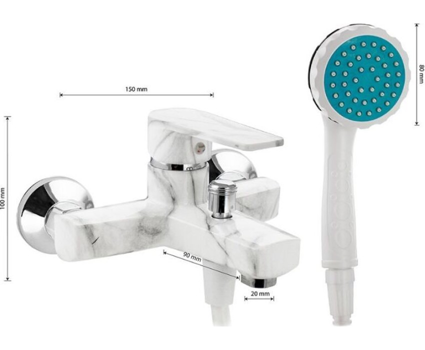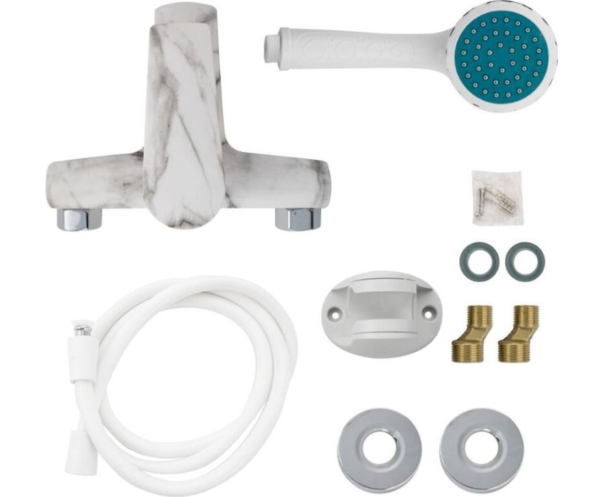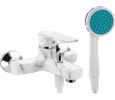 Смеситель из высокопрочного пластика АБС, БЕЛЫЙ МРАМОР в ванную / душевую комнату с коротким изливом, литой корпус, шаровый, с кнопочным дивертором на корпусе. Картридж d = 40 мм, литая ручка, хромированный аэратор для экономии воды, хромированные чашки и эксцентрики. Габаритные размеры: ширина 150 мм, высота корпуса 100 мм, длина излива 90 мм, душевая лейка d = 80 мм, шланг 150 см. Вес - 1,000 кг, объём - 0,00531 м3. В комплекте паспорт, корпус с изливом, дивертор, душевая лейка, шланг, кронштейн, комплект крепежа и прокладок.