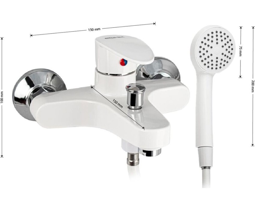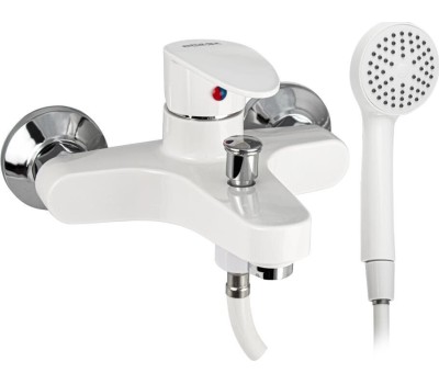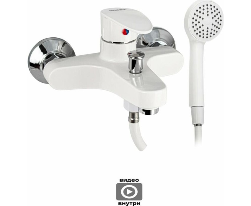 Смеситель из высокопрочного пластика АБС, БЕЛЫЙ в ванную / душевую комнату с коротким изливом, литой корпус, шаровый, с кнопочным дивертором на корпусе. Картридж d = 40 мм, литая ручка, хромированный аэратор для экономии воды, хромированные чашки и эксцентрики. Габаритные размеры: ширина 150 мм, высота корпуса 100 мм, длина излива 150 мм, душевая лейка d = 75 мм, шланг 150 см. Вес - 1,2 кг, объём - 0,00469 м3. В комплекте паспорт, корпус с изливом, дивертор, душевая лейка, шланг, кронштейн, комплект крепежа и прокладок.