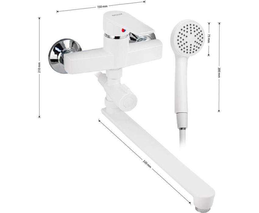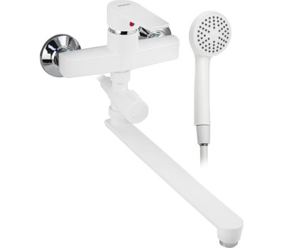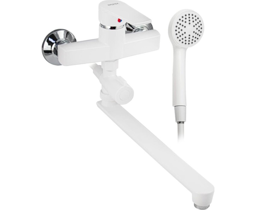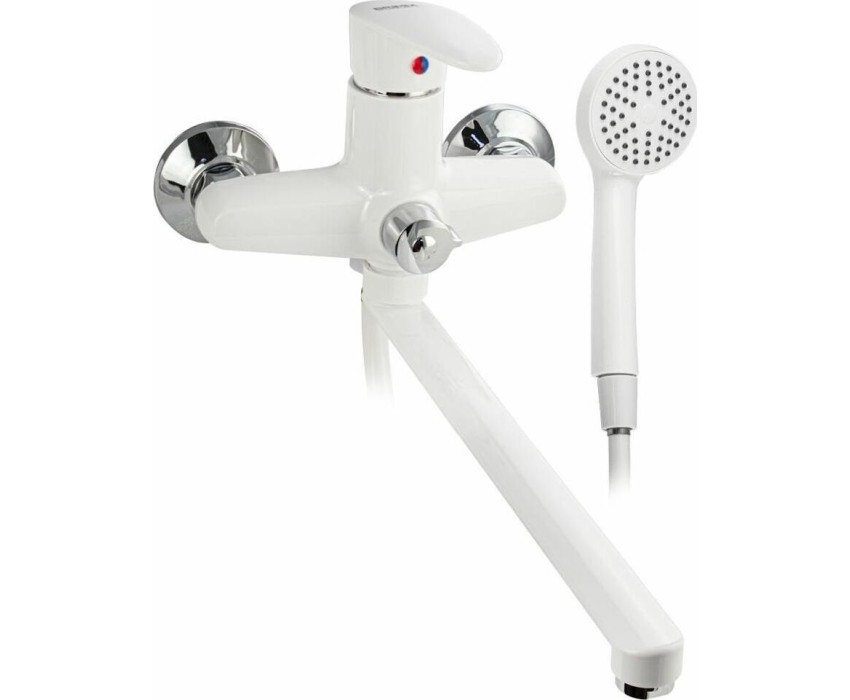 Смеситель из высокопрочного пластика АБС, БЕЛЫЙ в ванную / душевую комнату с длинным, плоским изливом, литой корпус, шаровый с дивертором м/к . Картридж d = 40 мм, литая ручка, хромированный, аэратор для экономии воды, хромированные чашки и эксцентрики. Габаритные размеры: ширина 150 мм, высота корпуса 210 мм, длина излива 320 мм, душевая лейка d = 80 мм, шланг 150 см. Вес - 1,300 кг, объём - 0 00700 м3. В комплекте паспорт, корпус с изливом, дивертор, душевая лейка, шланг, кронштейн, комплект крепежа и прокладок.