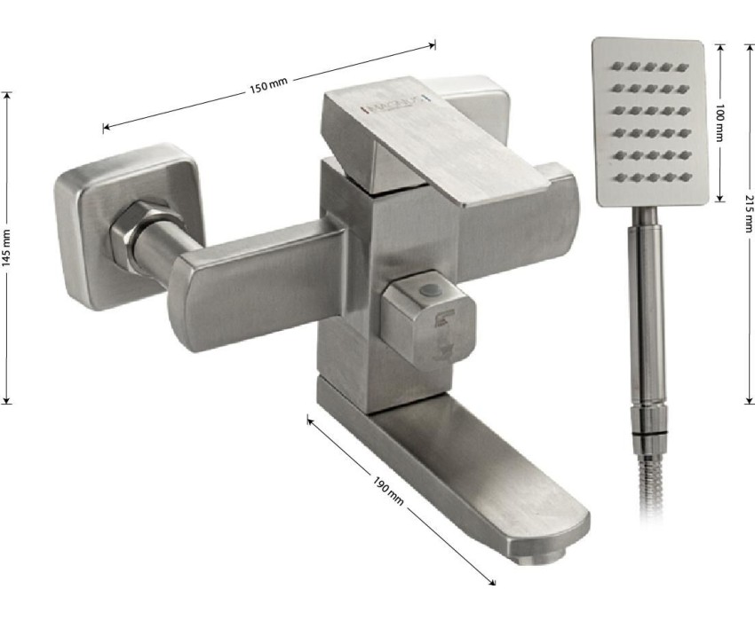 Смеситель матовый, из нержавеющей стали марки 304 в ванную / душевую комнату, с коротким изливом. Картридж d = 35 мм, ручка литая. Квадратный, большой корпус с дивертором м/к на корпусе, аэратор для экономии воды, чашки, гайки и эксцентрики из нержавеющей стали. Габаритные размеры: ширина 150 мм, высота 145 мм, длина 190 мм, длина шланга 150 см, высота лейки 215 мм. Вес - 2,63 кг, объём - 0,00783 м3. В комплекте корпус с изливом, дивертор, кронштейн, паспорт, крепёж, прокладки, лейка, шланг.