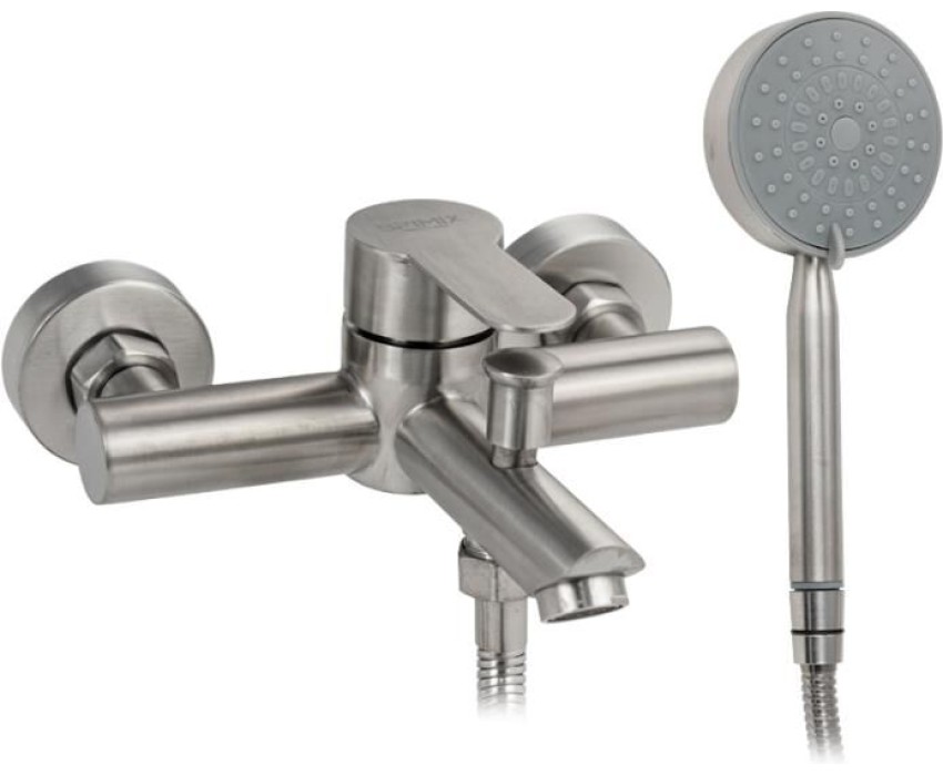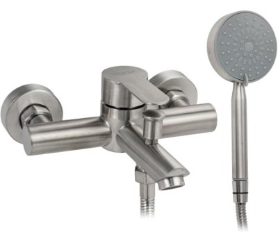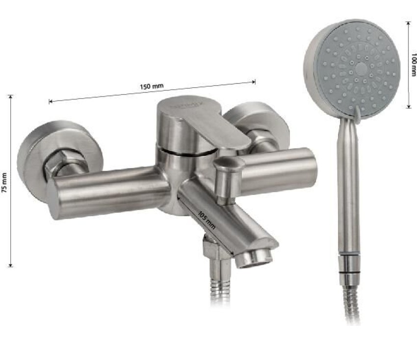 Смеситель матовый из нержавеющей стали марки 304 в ванную / душевую комнату, с коротким литым изливом. Картридж d = 35 мм, ручка литая. Дутый, большой корпус с дивертором м/к на корпусе, аэратор для экономии воды, чашки нержавеющая сталь, гайки и эксцентрики из нержавеющей стали. Габаритные размеры: ширина 150 мм, высота 75 мм, длина излива 105 мм, диаметр чашки 60 мм, длина шланга 150 см, лейка d = 100 мм. Вес - 1,81 кг, объём - 0,00600 м3. В комплекте корпус с изливом, дивертор, кронштейн, паспорт, крепёж, прокладки, лейка, шланг.