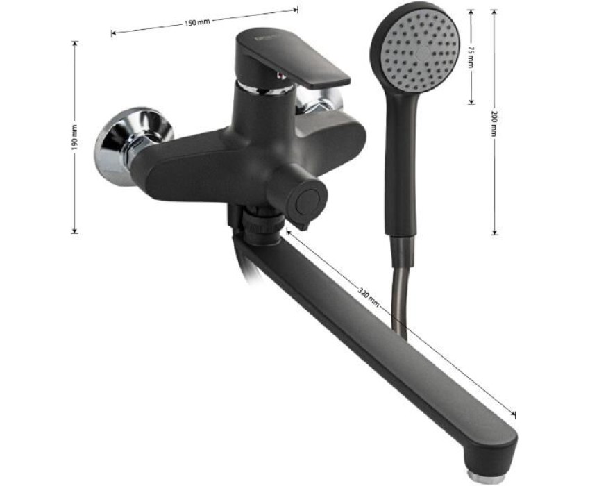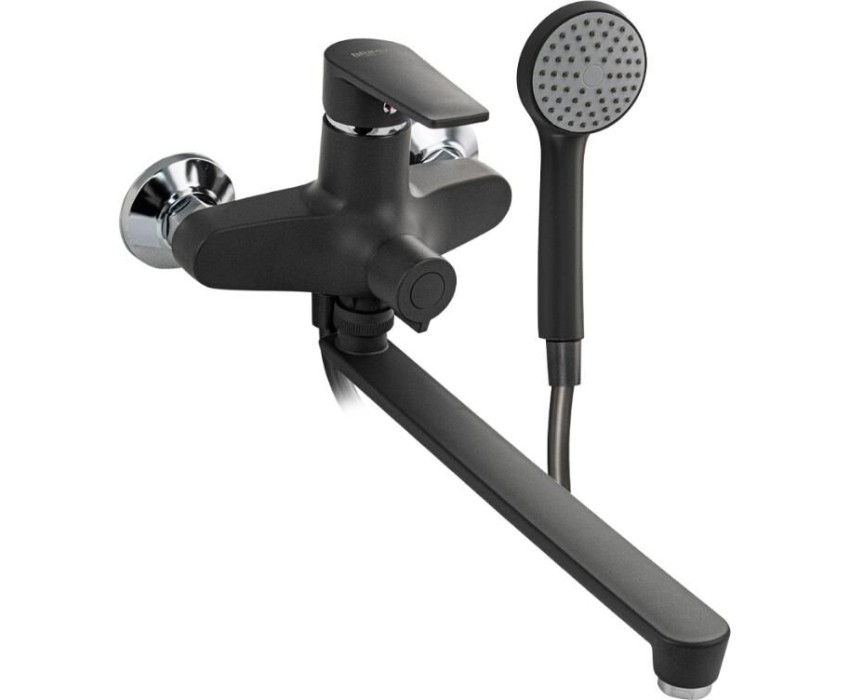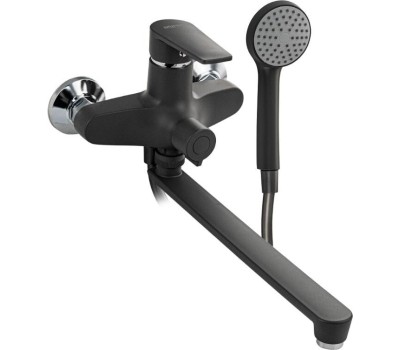 Смеситель из высокопрочного пластика АБС, цвет ГРАФИТ в ванную / душевую комнату с длинным, плоским изливом, литой корпус, шаровый с дивертором м/к на корпусе. Картридж d = 40 мм, литая ручка, хромированный, аэратор для экономии воды, хромированные чашки и эксцентрики. Габаритные размеры: ширина 150 мм, высота корпуса 190 мм, длина излива 320 мм, душевая лейка d = 75 мм, шланг 150 см. Вес - 1 350 кг, объём - 0 00700 м3. В комплекте паспорт, корпус с изливом, дивертор, душевая лейка, шланг, кронштейн, комплект крепежа и прокладок.