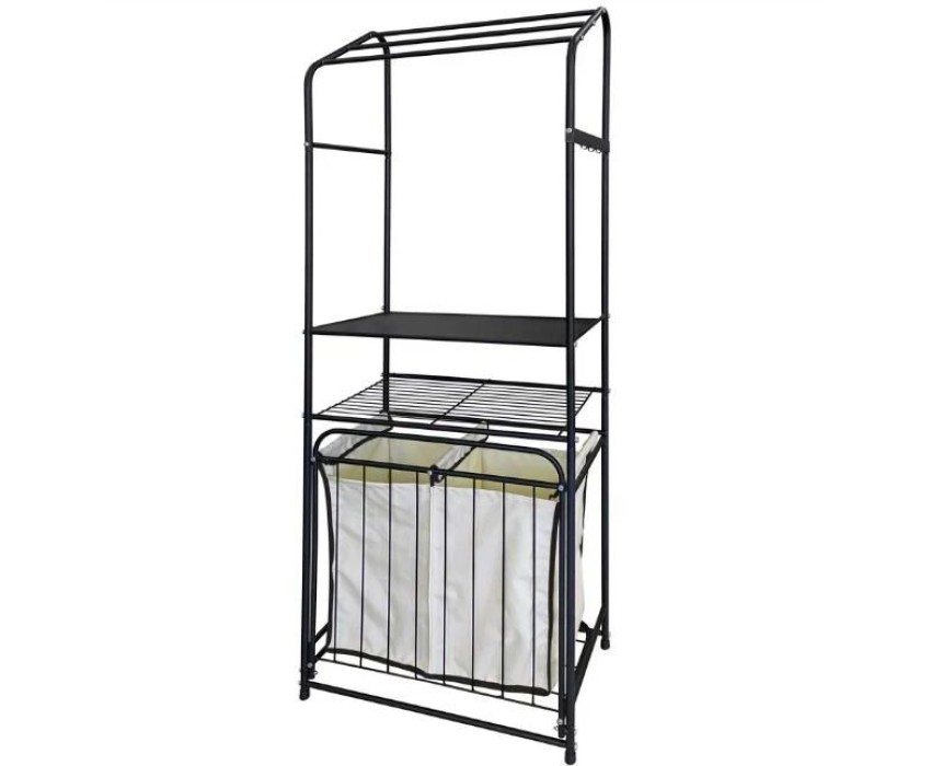 Двойная корзина для белья. Планка с крючками с одной стороны. Перекладины для сушки полотенец. Габариты 600х350х1600 мм. Размер упаковки 610х685х90 мм. Вес 6,6 кг. Высота между полками 190 мм
