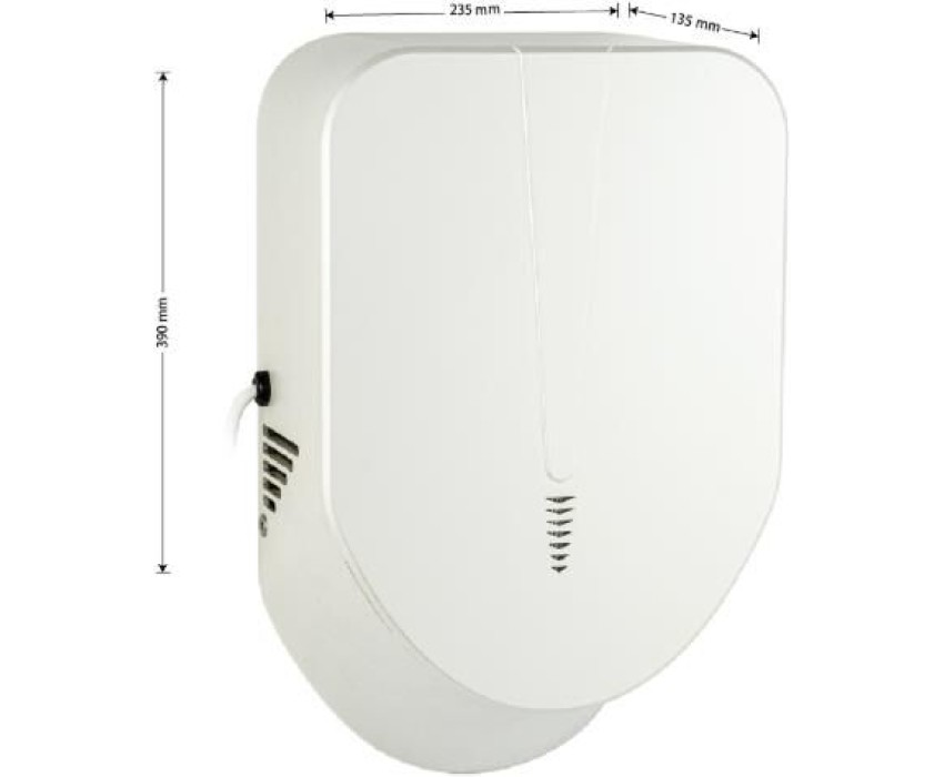 Электрическая сушилка для рук, скоростная, c направленным потоком воздуха из двух плоских сопел, расположенных под углом друг к другу, цвет белый, с неоновой подсветкой, незаменима в местах с большой проходимостью людей (бизнес-центры, торговые центры, гостиницы, кинотеатры, рестораны). Корпус сушилки изготовлен из прочного пластика АБС белого цвета, который выдерживает различные механические воздействия. Прибор отличается средней мощностью и большой скоростью, что позволит использовать оборудование в различных помещениях с ограниченным электропотреблением или старой проводкой. Для удобства эксплуатации в сушилке для рук предусмотрен инфракрасный датчик движения, который включает прибор без прикосновения к нему, при поднесении рук. Сушилка оснащена надёжным и долговечным двигателем. Прибор облачён в ударопрочный корпус. Параметры - 1500Вт, автоматическая, АС 220-230В 50/60Гц, сенсор включения 50 - 150 мм, скорость потока >95 м/c, температура воздуха >40°C, влагозащищенность IPX1. В комплекте сушилка, паспорт. Габаритные размеры: высота 390 мм, ширина 235 мм, глубина 135 мм. Вес - 4 кг, объем - 0,02424 м3.
