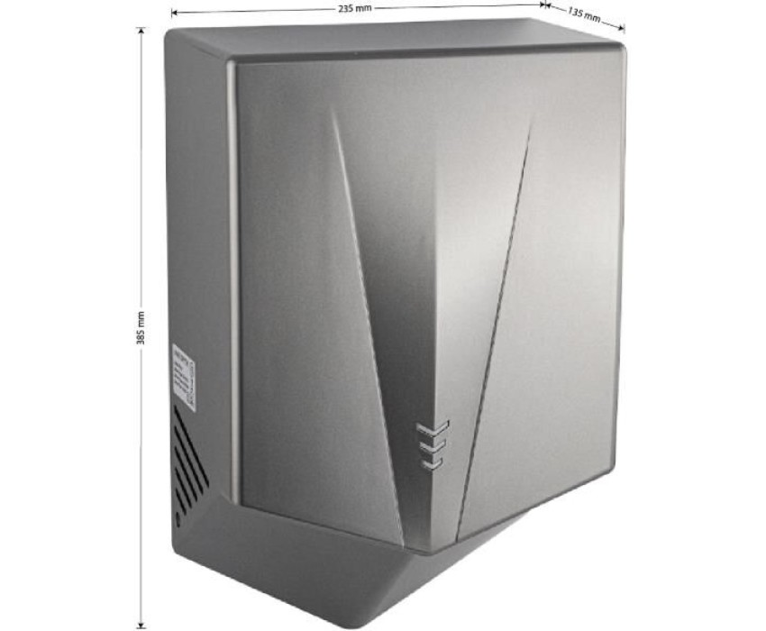 Электрическая сушилка для рук, скоростная, c направленным потоком воздуха из двух плоских сопел, расположенных под углом друг к другу, цвет серый, с неоновой подсветкой, незаменима в местах с большой проходимостью людей (бизнес-центры, торговые центры, гостиницы, кинотеатры, рестораны). Корпус сушилки изготовлен из прочного пластика АБС серого цвета, который выдерживает различные механические воздействия. Прибор отличается средней мощностью и большой скоростью, что позволит использовать оборудование в различных помещениях с ограниченным электропотреблением или старой проводкой. Для удобства эксплуатации в сушилке для рук предусмотрен инфракрасный датчик движения, который включает прибор без прикосновения к нему, при поднесении рук. Сушилка оснащена надёжным и долговечным двигателем. Прибор облачён в ударопрочный корпус. Параметры - 1300Вт, автоматическая, АС 220-230В 50/60Гц, сенсор включения 50 - 150 мм, скорость потока >95 м/c, температура воздуха >40°C, влагозащищенность IPX4. В комплекте сушилка, паспорт. Габаритные размеры: высота 385 мм, ширина 235 мм, глубина 135 мм. Вес - 4.65кг, объем -0.02835 м3