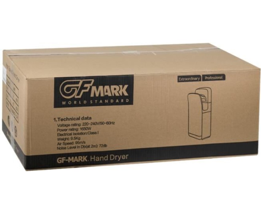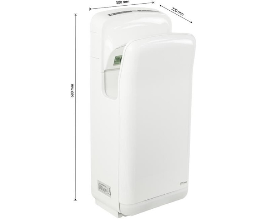 Сушилка для рук, скоростная, бизнес класса, цвет белый, погружная, пластик АБС, 1650Вт, 220В, 50Гц, время сушки 5-7 секунд , обороты 24000 в минуту, защита IPX4, температура потока 65 +15-15 градусов С, из пластика АБС, воздушный фильтр и фильтр HEPA, щёточный мотор. Габаритные размеры: высота 680 мм, ширина 300 мм, глубина 220 мм. Вес - 9,5 кг, объем - 0,08500 м3