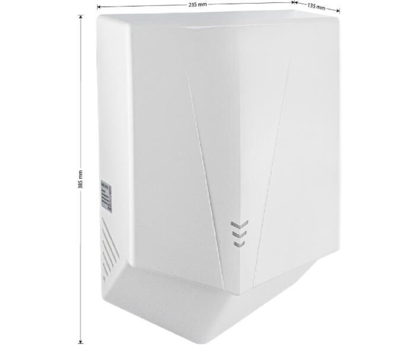 Электрическая сушилка для рук, скоростная, c направленным потоком воздуха из двух плоских сопел, расположенных под углом друг к другу, цвет белый, с неоновой подсветкой, незаменима в местах с большой проходимостью людей (бизнес-центры, торговые центры, гостиницы, кинотеатры, рестораны). Корпус сушилки изготовлен из прочного пластика АБС белого цвета, который выдерживает различные механические воздействия. Прибор отличается средней мощностью и большой скоростью, что позволит использовать оборудование в различных помещениях с ограниченным электропотреблением или старой проводкой. Для удобства эксплуатации в сушилке для рук предусмотрен инфракрасный датчик движения, который включает прибор без прикосновения к нему, при поднесении рук. Сушилка оснащена надёжным и долговечным двигателем. Прибор облачён в ударопрочный корпус. Параметры - 1300Вт, автоматическая, АС 220-230В 50/60Гц, сенсор включения 50 - 150 мм, скорость потока >95 м/c, температура воздуха >40°C, влагозащищенность IPX4. В комплекте сушилка, паспорт. Габаритные размеры: высота 385 мм, ширина 235 мм, глубина 135 мм. Вес - 4.65кг, объем - 0.02835 м3