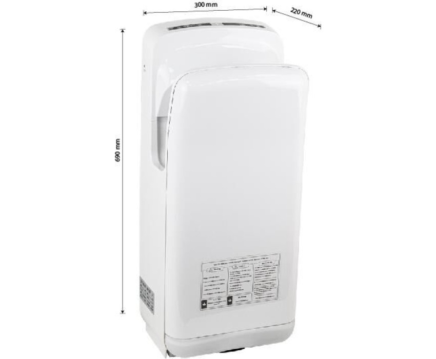 Сушилка для рук погружная, высокоскоростная, бизнес класса, корпус пластик АБС, цвет белый, с неоновой подсветкой. Питание-220 В / 50 Гц. Номинальная мощность - 1650 Вт. Класс водонепроницаемости - IPX1. Время сушки-7 сек. Габаритные размеры: высота 690 мм, ширина 300 мм, глубина 220 мм. Вес - 10,000 кг, объем - 0,07660 м3. В комплекте сушилка, паспорт, крепёж.