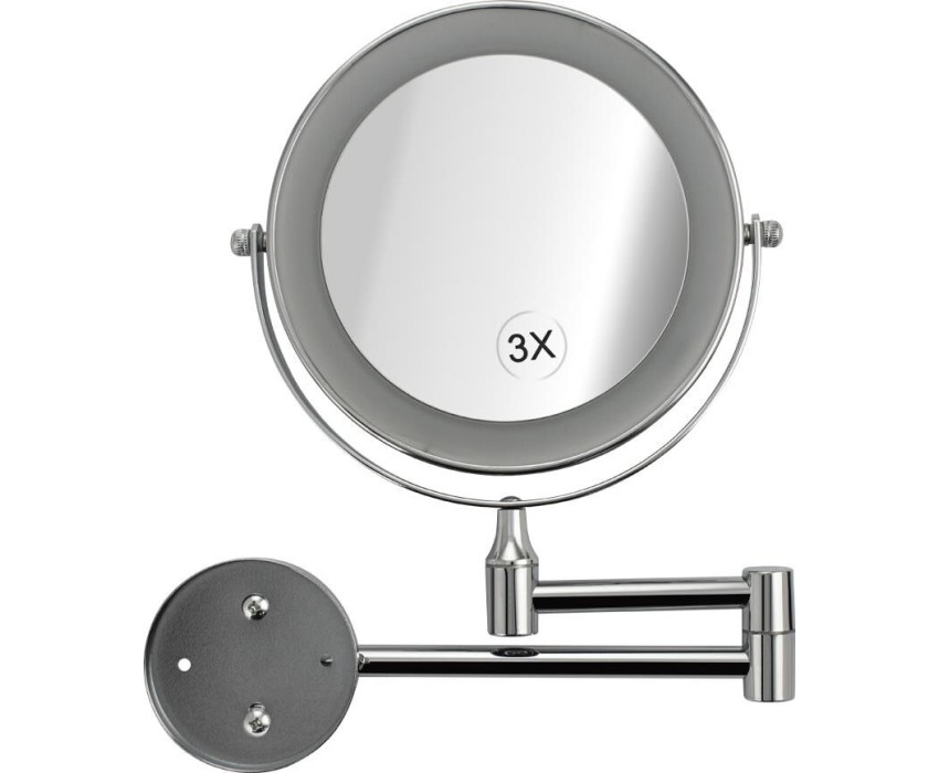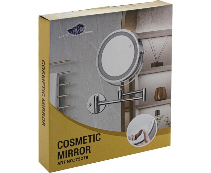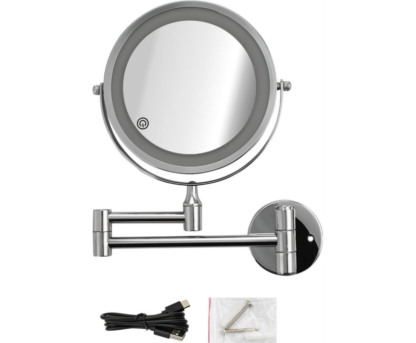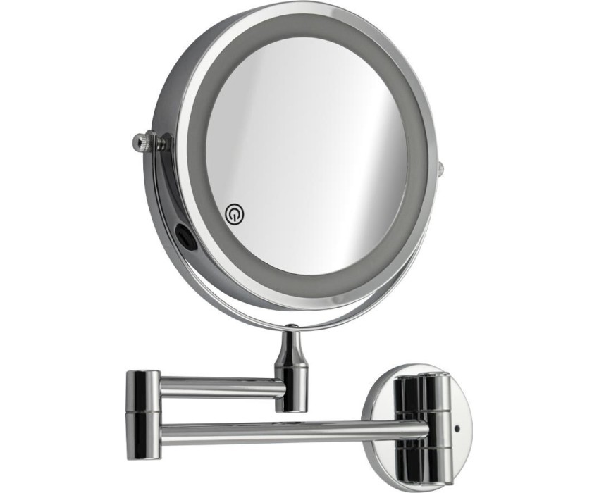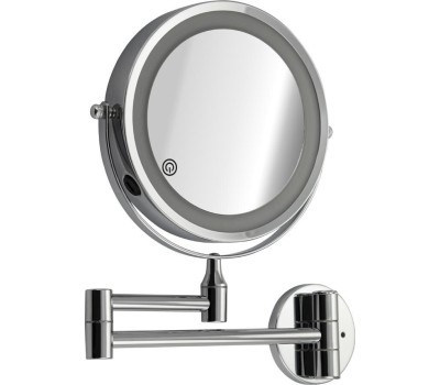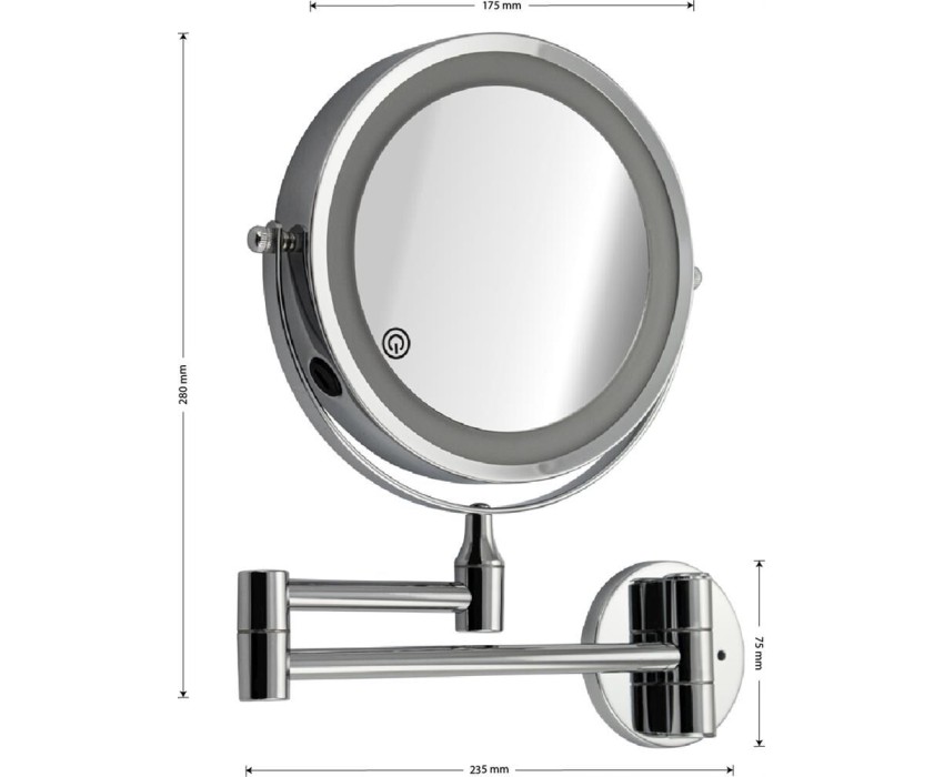 Зеркало косметическое, настенное, с LED подсветкой, сенсорное включение, зарядка Type - C, шнур в комплекте, корпус из нержавеющей стали, цвет хромированный. Габаритные размеры: высота 280 мм, длина 235 мм, диаметр зеркала 175 мм, диаметр посадочного седла 75 мм.