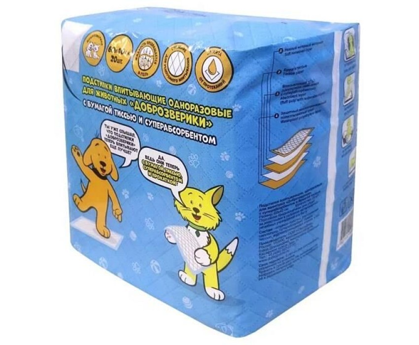 MULTIDOM Подстилки впитывающие одноразовые для животных с суперабсорбентом "Доброзверики", 60х40см, 20шт. ЖТС60Х40